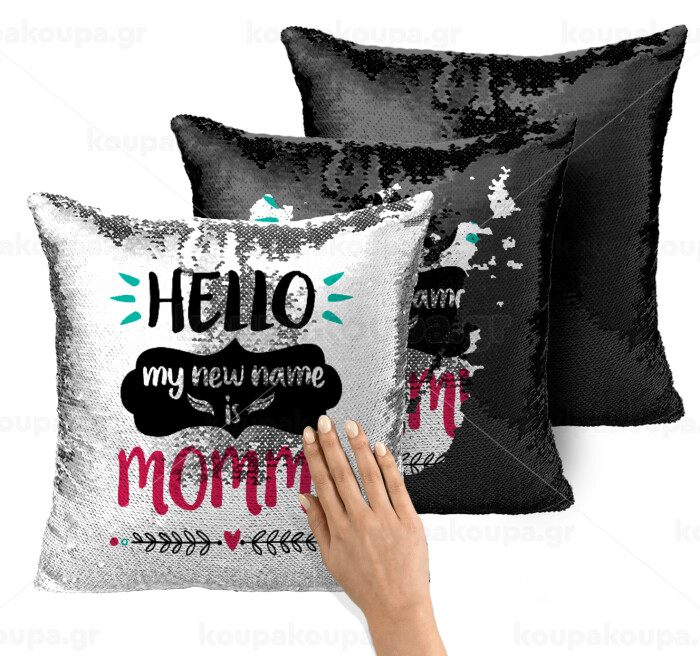 Hello, my new name is Mommy, Μαξιλάρι καναπέ Μαγικό Μαύρο με πούλιες 40x40cm περιέχεται το γέμισμα