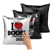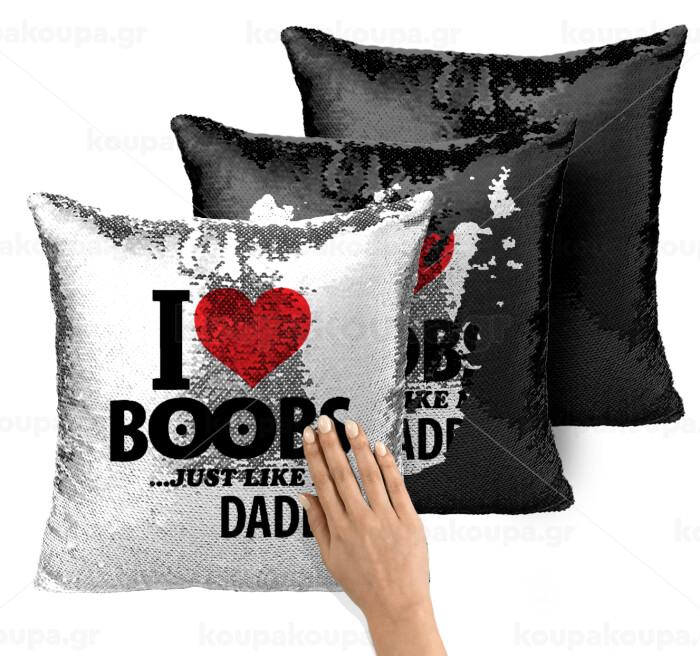 I Love boobs ...just like my daddy, Μαξιλάρι καναπέ Μαγικό Μαύρο με πούλιες 40x40cm περιέχεται το γέμισμα