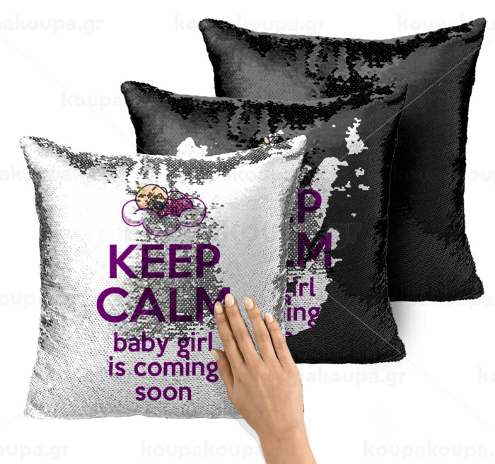 KEEP CALM baby girl is coming soon!!!, Μαξιλάρι καναπέ Μαγικό Μαύρο με πούλιες 40x40cm περιέχεται το γέμισμα