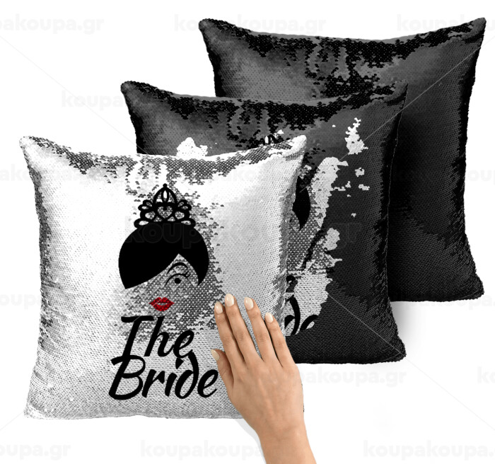 The Bride red kiss, Μαξιλάρι καναπέ Μαγικό Μαύρο με πούλιες 40x40cm περιέχεται το γέμισμα