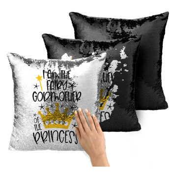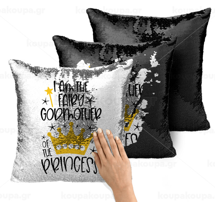 I am the fairy Godmother of the Princess, Μαξιλάρι καναπέ Μαγικό Μαύρο με πούλιες 40x40cm περιέχεται το γέμισμα