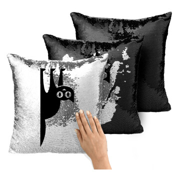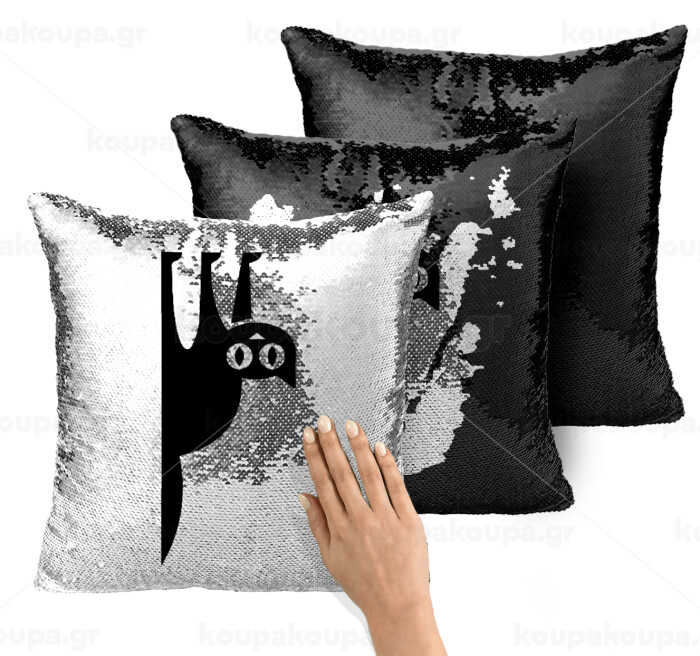 Cat upside down, Μαξιλάρι καναπέ Μαγικό Μαύρο με πούλιες 40x40cm περιέχεται το γέμισμα