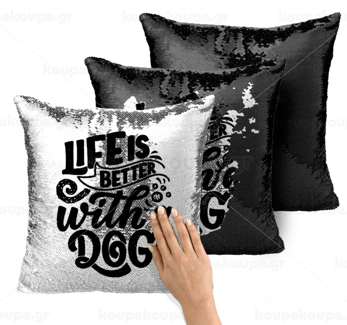 Life is better with a DOG, Μαξιλάρι καναπέ Μαγικό Μαύρο με πούλιες 40x40cm περιέχεται το γέμισμα