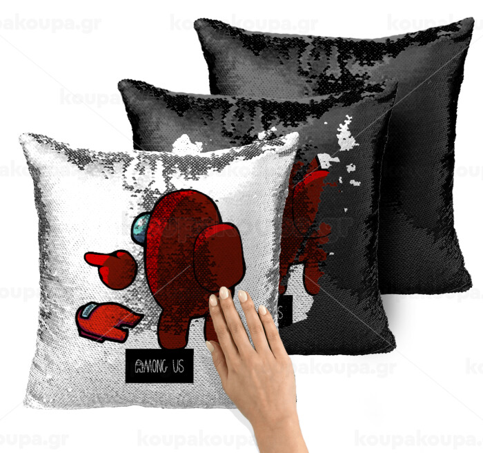 Among US i am impostor..., Μαξιλάρι καναπέ Μαγικό Μαύρο με πούλιες 40x40cm περιέχεται το γέμισμα