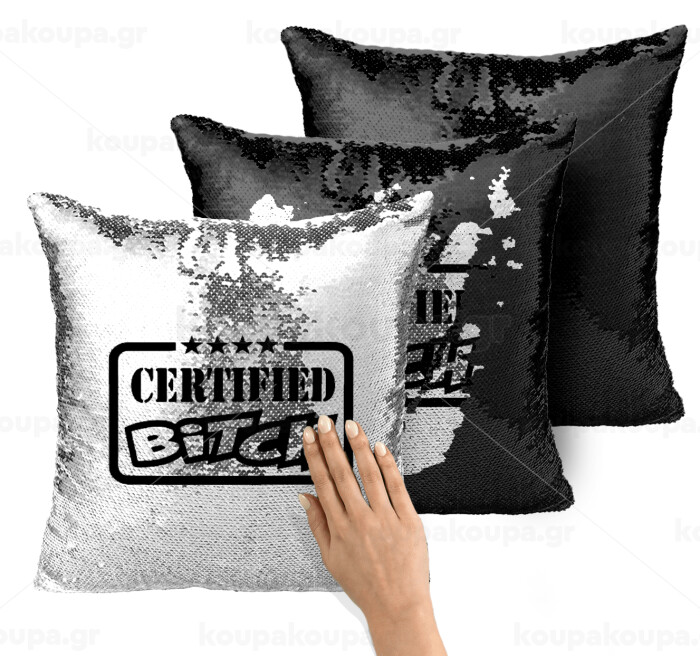 Certified Bitch, Μαξιλάρι καναπέ Μαγικό Μαύρο με πούλιες 40x40cm περιέχεται το γέμισμα