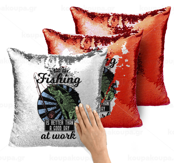 A bad day FISHING is better than a good day at work, Μαξιλάρι καναπέ Μαγικό Κόκκινο με πούλιες 40x40cm περιέχεται το γέμισμα
