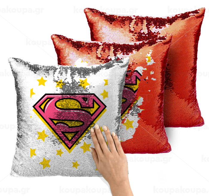 Superman Pink, Μαξιλάρι καναπέ Μαγικό Κόκκινο με πούλιες 40x40cm περιέχεται το γέμισμα
