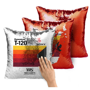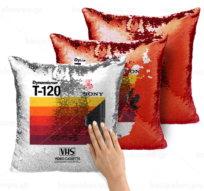 VHS sony dynamicron T-120, Μαξιλάρι καναπέ Μαγικό Κόκκινο με πούλιες 40x40cm περιέχεται το γέμισμα