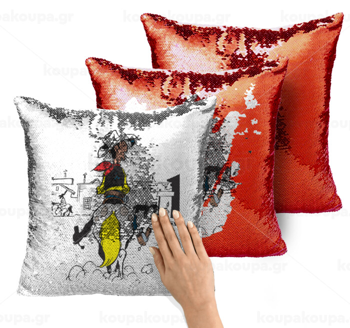 Lucky Luke comic, Μαξιλάρι καναπέ Μαγικό Κόκκινο με πούλιες 40x40cm περιέχεται το γέμισμα