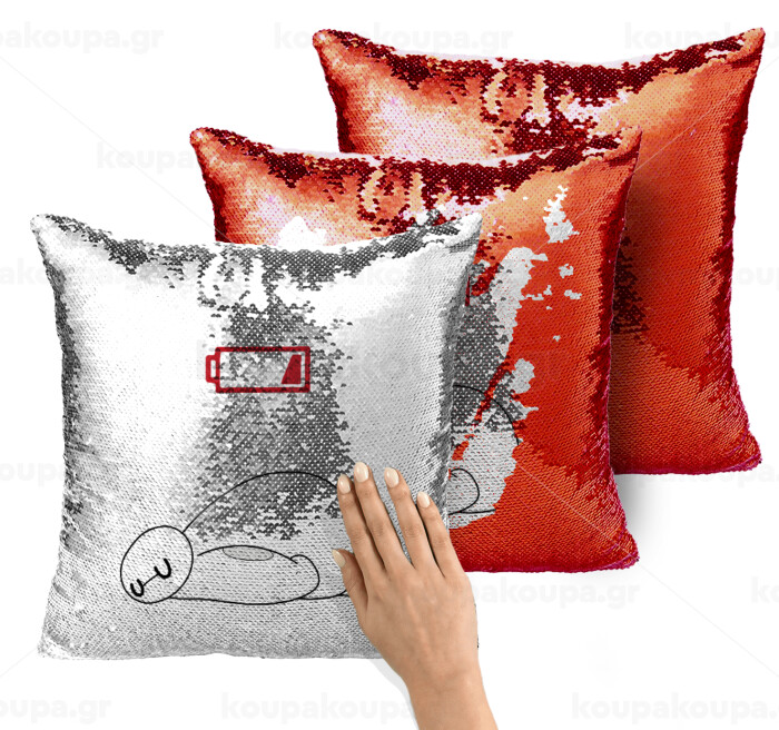 Baymax battery low, Μαξιλάρι καναπέ Μαγικό Κόκκινο με πούλιες 40x40cm περιέχεται το γέμισμα
