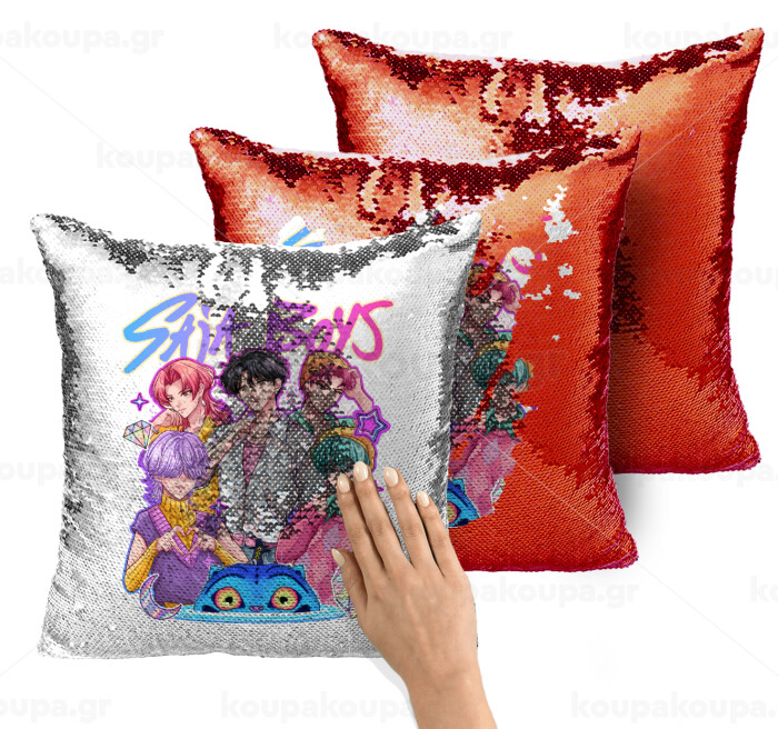 Huntrix Saja Boys, Μαξιλάρι καναπέ Μαγικό Κόκκινο με πούλιες 40x40cm περιέχεται το γέμισμα