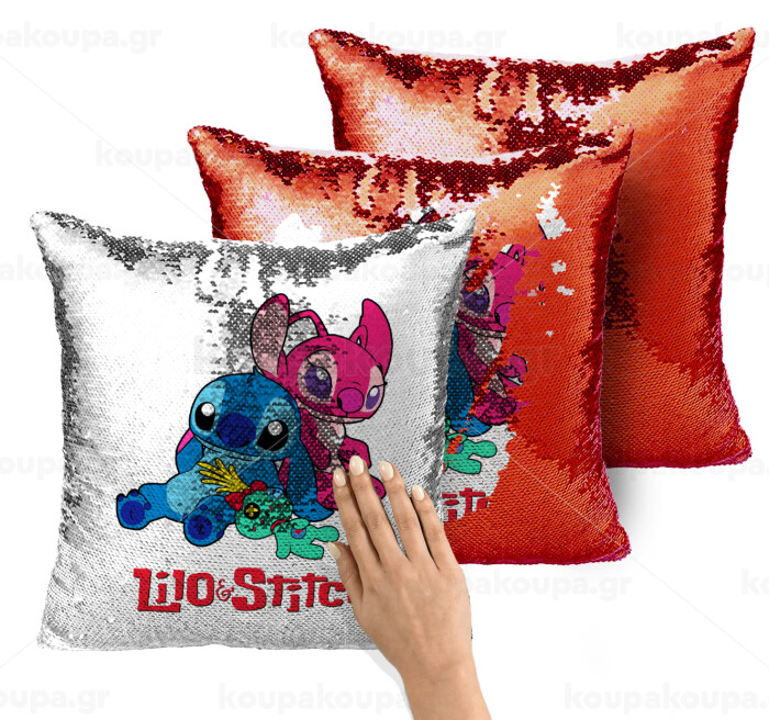 Lilo & Stitch, Μαξιλάρι καναπέ Μαγικό Κόκκινο με πούλιες 40x40cm περιέχεται το γέμισμα