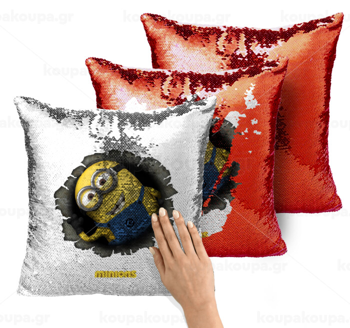 Minions hi, Μαξιλάρι καναπέ Μαγικό Κόκκινο με πούλιες 40x40cm περιέχεται το γέμισμα