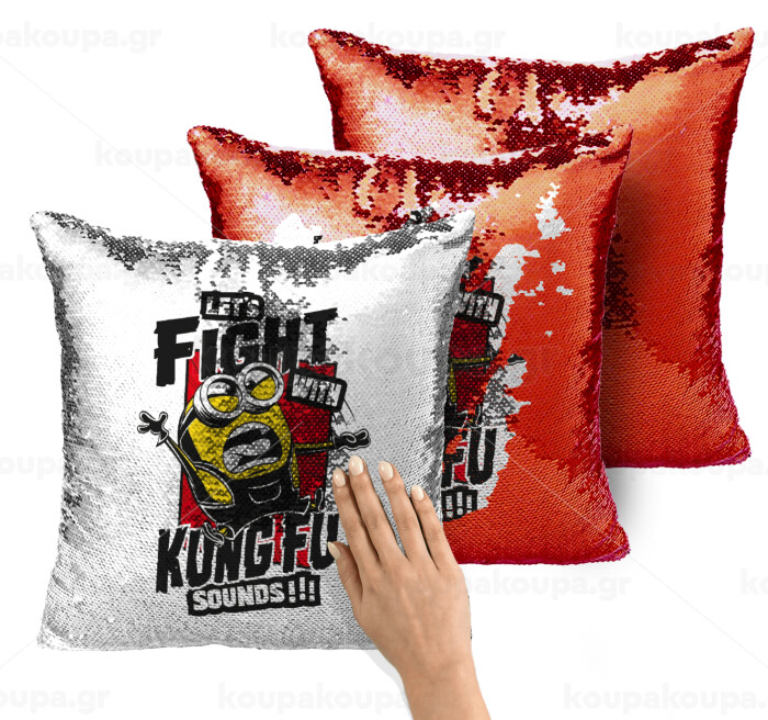 Minions Let's fight with kung fu sounds, Μαξιλάρι καναπέ Μαγικό Κόκκινο με πούλιες 40x40cm περιέχεται το γέμισμα