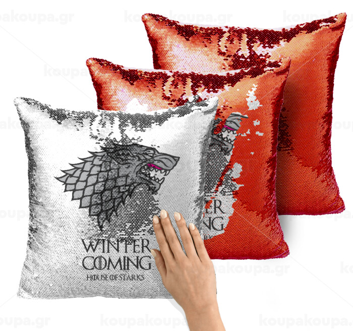 GOT House of Starks, winter coming, Μαξιλάρι καναπέ Μαγικό Κόκκινο με πούλιες 40x40cm περιέχεται το γέμισμα