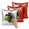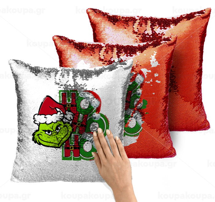 Grinch ho ho ho, Μαξιλάρι καναπέ Μαγικό Κόκκινο με πούλιες 40x40cm περιέχεται το γέμισμα