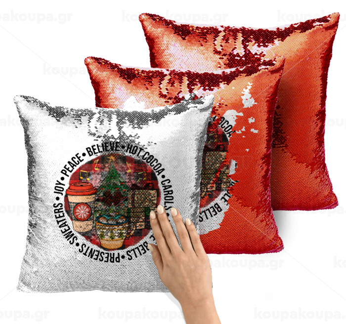 Joy, Peace, Believe, Hot Cocoa, Carols, Μαξιλάρι καναπέ Μαγικό Κόκκινο με πούλιες 40x40cm περιέχεται το γέμισμα