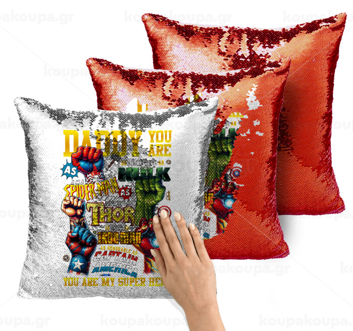 Daddy You Are my Hero, Μαξιλάρι καναπέ Μαγικό Κόκκινο με πούλιες 40x40cm περιέχεται το γέμισμα