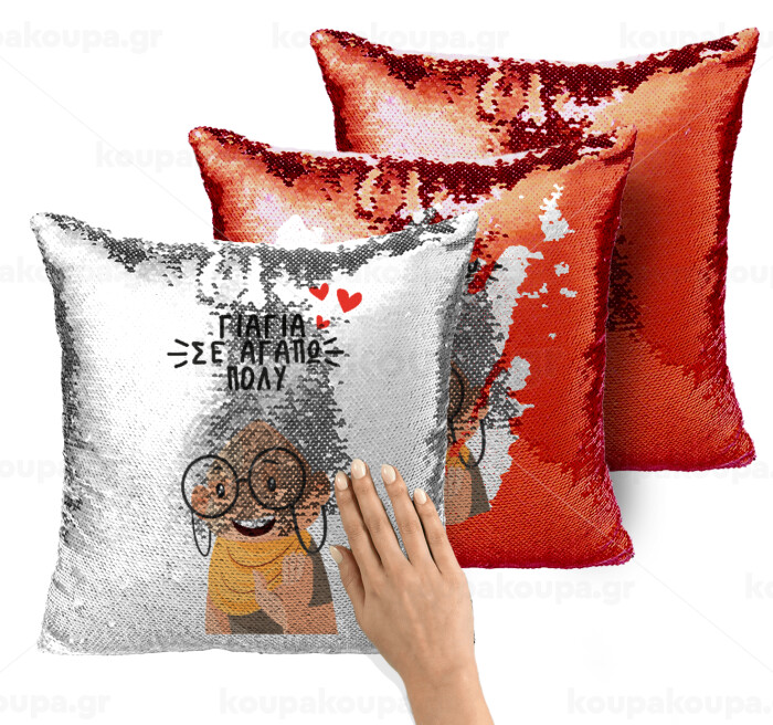 Γιαγιά σε αγαπώ πολύ!, Μαξιλάρι καναπέ Μαγικό Κόκκινο με πούλιες 40x40cm περιέχεται το γέμισμα