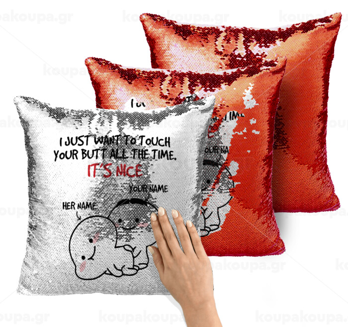 I Just Want To Touch Your Butt All The Time, Μαξιλάρι καναπέ Μαγικό Κόκκινο με πούλιες 40x40cm περιέχεται το γέμισμα