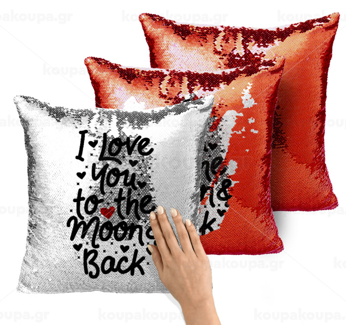 I love you to the moon and back with hearts, Μαξιλάρι καναπέ Μαγικό Κόκκινο με πούλιες 40x40cm περιέχεται το γέμισμα