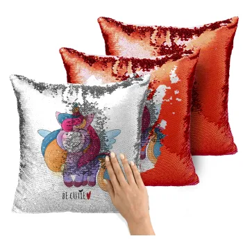 Pink unicorn, Μαξιλάρι καναπέ Μαγικό Κόκκινο με πούλιες 40x40cm περιέχεται το γέμισμα