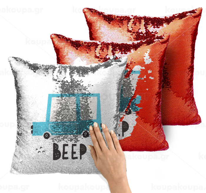 Car BEEP..., Μαξιλάρι καναπέ Μαγικό Κόκκινο με πούλιες 40x40cm περιέχεται το γέμισμα
