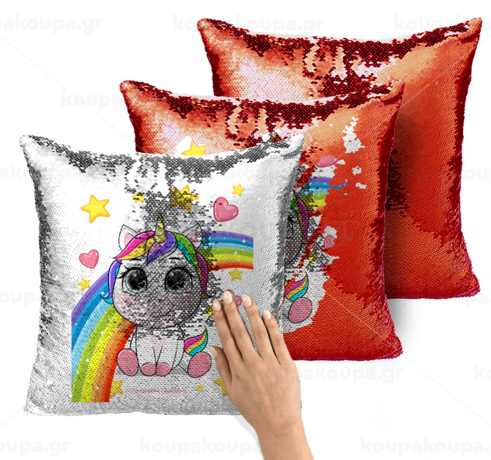 Unicorn baby με όνομα, Μαξιλάρι καναπέ Μαγικό Κόκκινο με πούλιες 40x40cm περιέχεται το γέμισμα