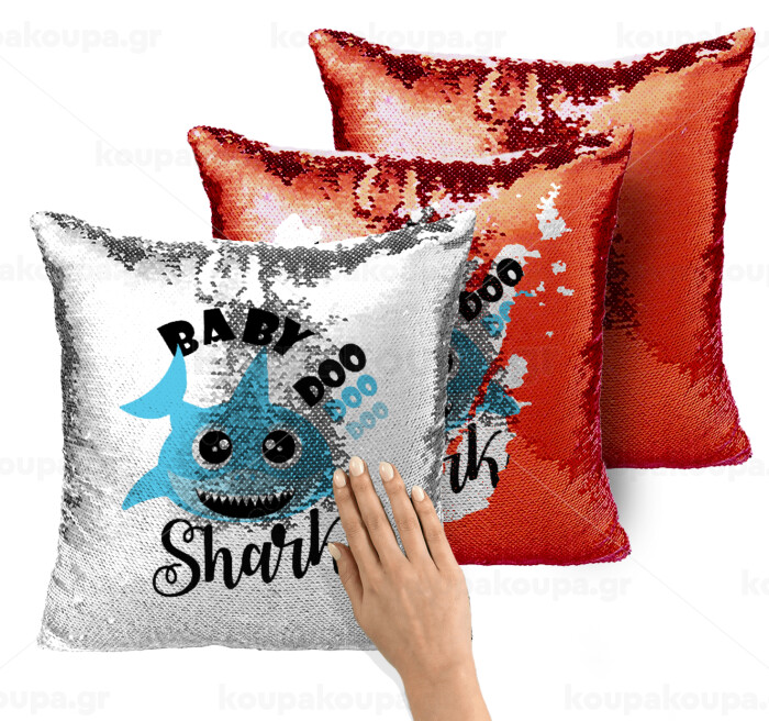 Baby Shark (boy), Μαξιλάρι καναπέ Μαγικό Κόκκινο με πούλιες 40x40cm περιέχεται το γέμισμα