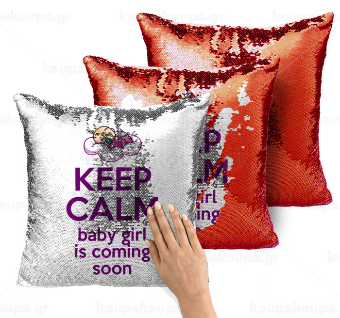 KEEP CALM baby girl is coming soon!!!, Μαξιλάρι καναπέ Μαγικό Κόκκινο με πούλιες 40x40cm περιέχεται το γέμισμα