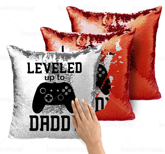 Leveled to Daddy, Μαξιλάρι καναπέ Μαγικό Κόκκινο με πούλιες 40x40cm περιέχεται το γέμισμα