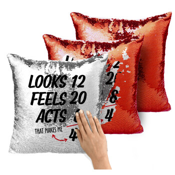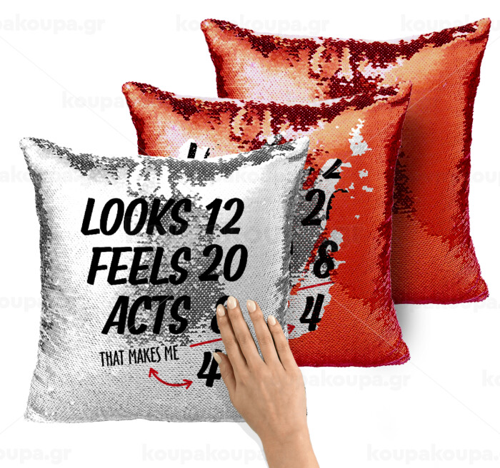 Looks, feels, acts LIKE your AGE, Μαξιλάρι καναπέ Μαγικό Κόκκινο με πούλιες 40x40cm περιέχεται το γέμισμα