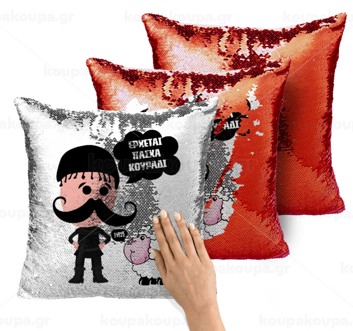 Κρητικός "Έρχεται Πάσχα κουράδι", Μαξιλάρι καναπέ Μαγικό Κόκκινο με πούλιες 40x40cm περιέχεται το γέμισμα