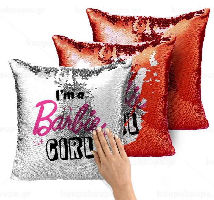 I'm Barbie girl, Μαξιλάρι καναπέ Μαγικό Κόκκινο με πούλιες 40x40cm περιέχεται το γέμισμα