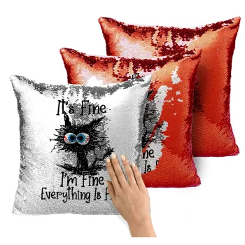 Cat, It's Fine I'm Fine Everything Is Fine, Μαξιλάρι καναπέ Μαγικό Κόκκινο με πούλιες 40x40cm περιέχεται το γέμισμα