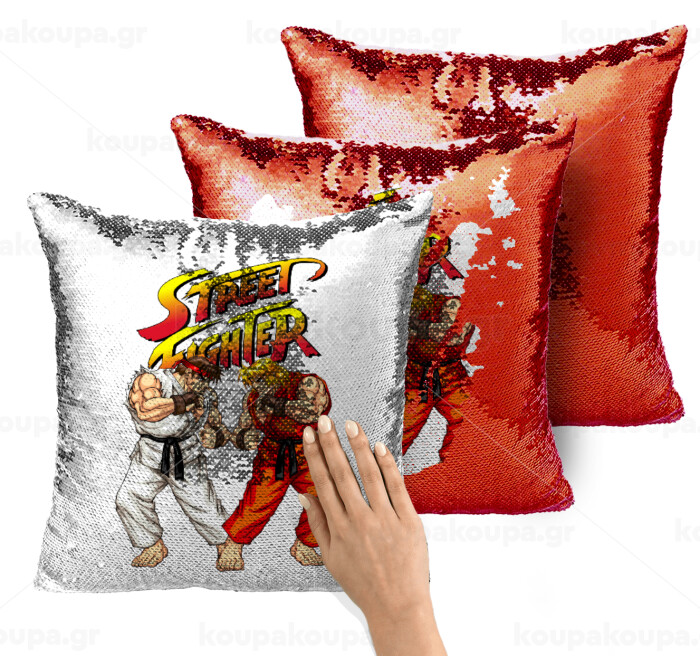 Street fighter, Μαξιλάρι καναπέ Μαγικό Κόκκινο με πούλιες 40x40cm περιέχεται το γέμισμα