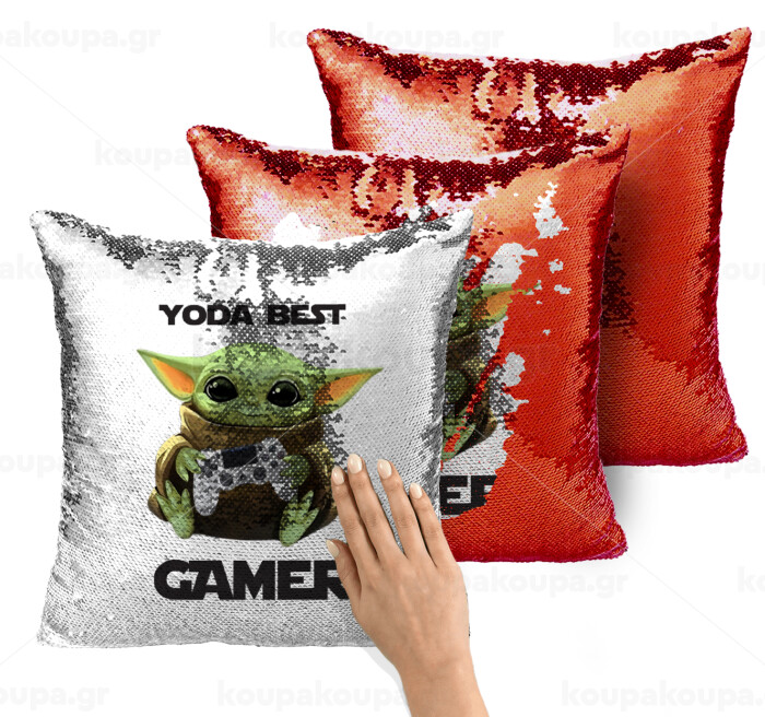 Yoda Best Gamer, Μαξιλάρι καναπέ Μαγικό Κόκκινο με πούλιες 40x40cm περιέχεται το γέμισμα