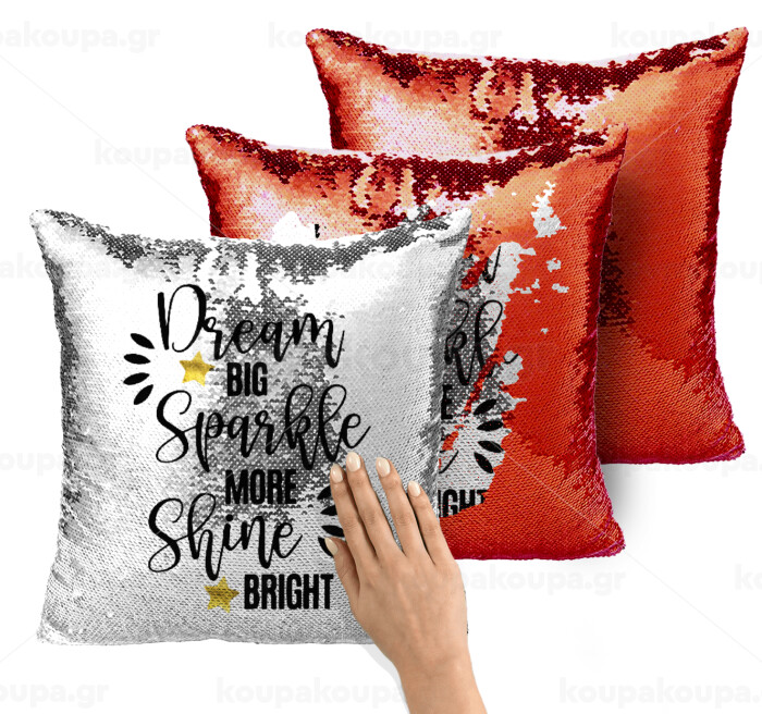 Dream big, Sparkle more, Shine bright, Μαξιλάρι καναπέ Μαγικό Κόκκινο με πούλιες 40x40cm περιέχεται το γέμισμα
