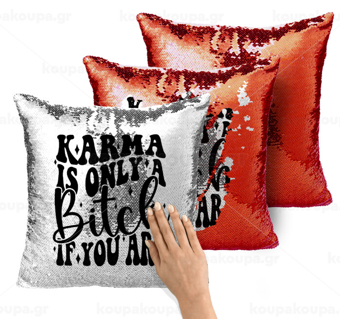 Karma is Only A Bitch if You Are, Μαξιλάρι καναπέ Μαγικό Κόκκινο με πούλιες 40x40cm περιέχεται το γέμισμα