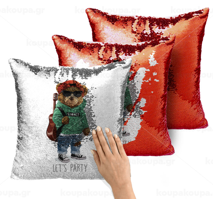 Let's Party Bear, Μαξιλάρι καναπέ Μαγικό Κόκκινο με πούλιες 40x40cm περιέχεται το γέμισμα