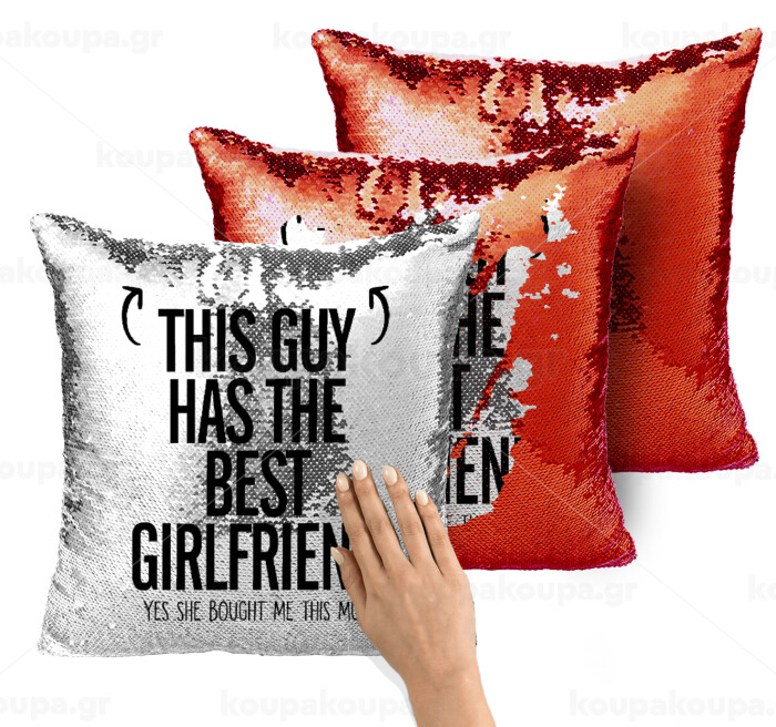 This guy has the best Girlfriend, Μαξιλάρι καναπέ Μαγικό Κόκκινο με πούλιες 40x40cm περιέχεται το γέμισμα