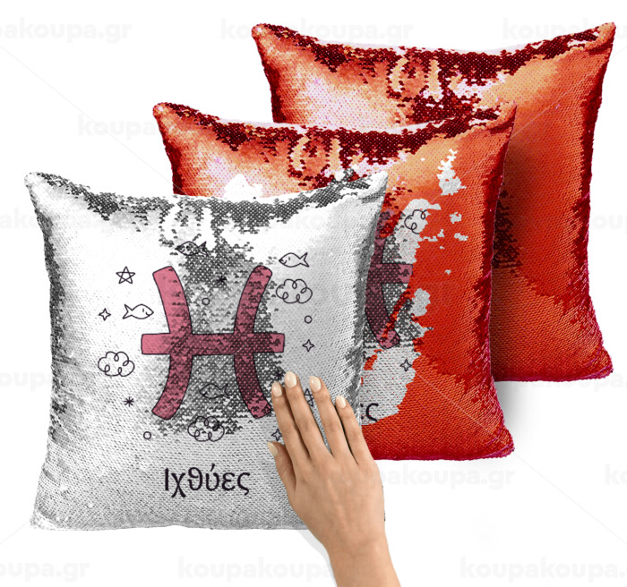 Ζώδια Ιχθύες, Μαξιλάρι καναπέ Μαγικό Κόκκινο με πούλιες 40x40cm περιέχεται το γέμισμα