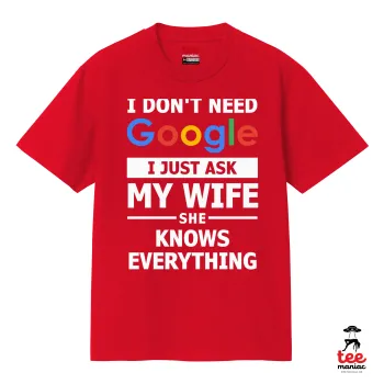 I don't need Google, just ask my WIFE, Κλασικό T-Shirt, διπλής ραφής, χωρίς πλευρικές ραφές ΚΟΚΚΙΝΟ από 100% βαμβάκι. Vegan & OEKO-TEX πιστοποιημένο.
