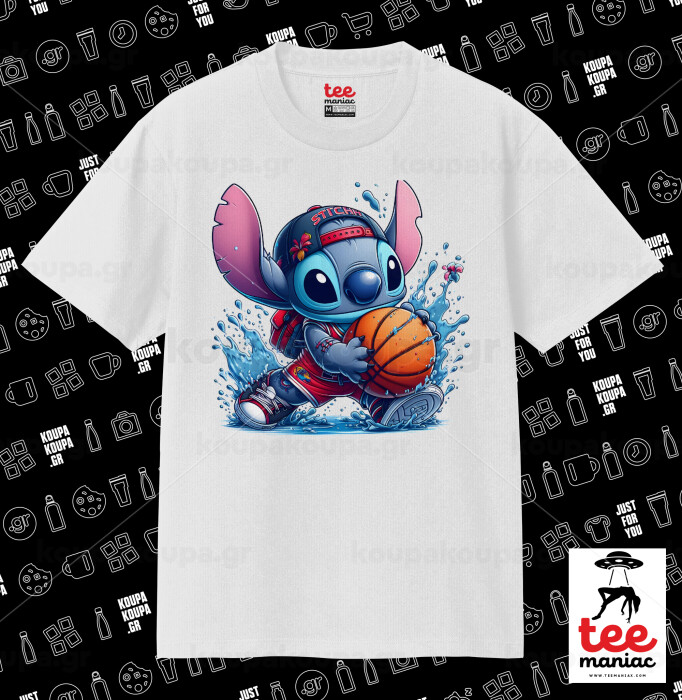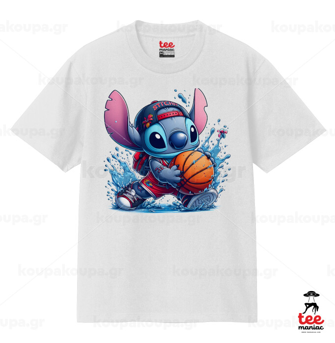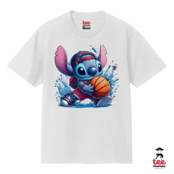 Stitch Basketball, Κλασικό T-Shirt, διπλής ραφής, χωρίς πλευρικές ραφές ΛΕΥΚΟ από 100% βαμβάκι. Vegan & OEKO-TEX πιστοποιημένο.