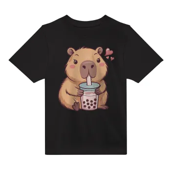 Capybara Bubble Tea, Άνετο παιδικό T-Shirt ΜΑΥΡΟ από 100% βαμβάκι, για κάθε μέρα. Vegan & OEKO-TEX πιστοποιημένο.