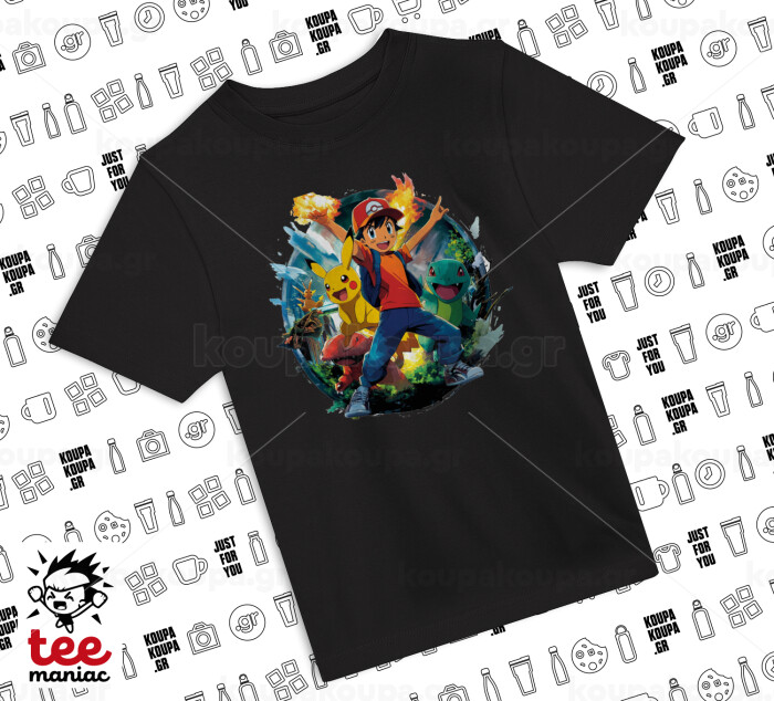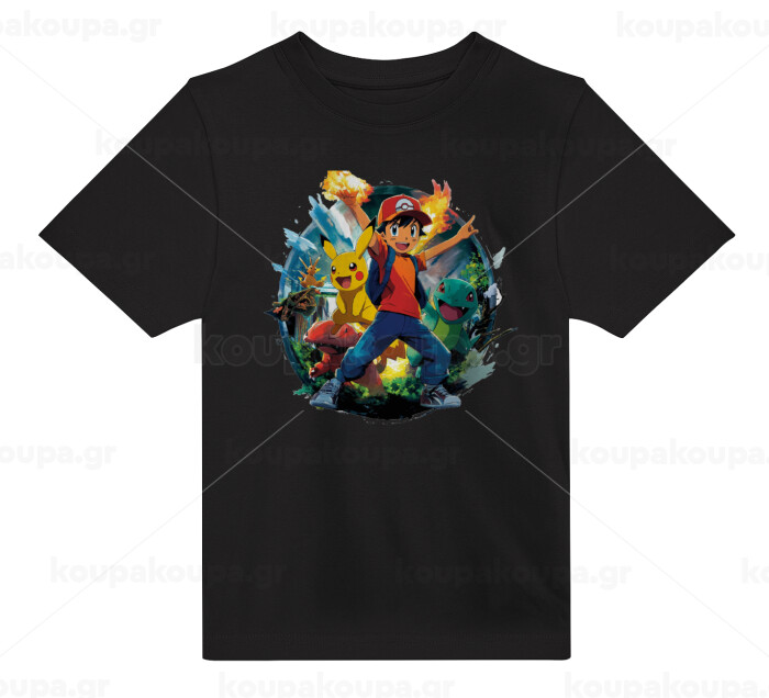 Ash Ketchum & Pikachu, Άνετο παιδικό T-Shirt ΜΑΥΡΟ από 100% βαμβάκι, για κάθε μέρα. Vegan & OEKO-TEX πιστοποιημένο.