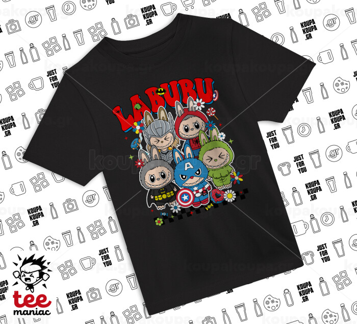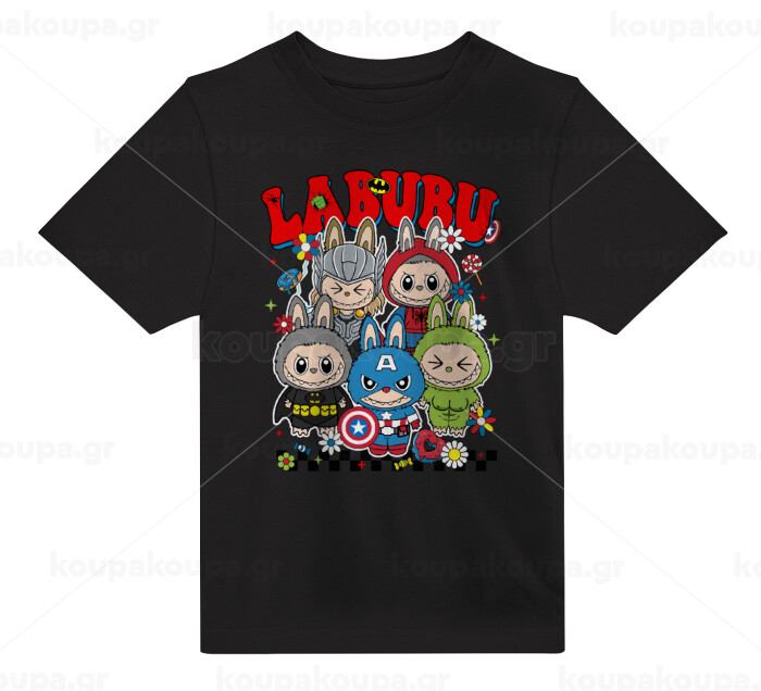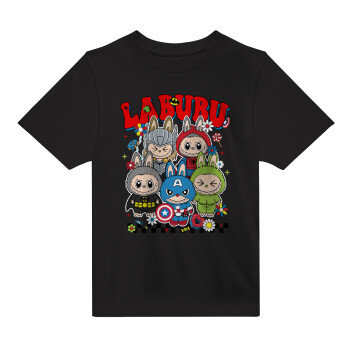 Labubu superheroes, Άνετο παιδικό T-Shirt ΜΑΥΡΟ από 100% βαμβάκι, για κάθε μέρα. Vegan & OEKO-TEX πιστοποιημένο.
