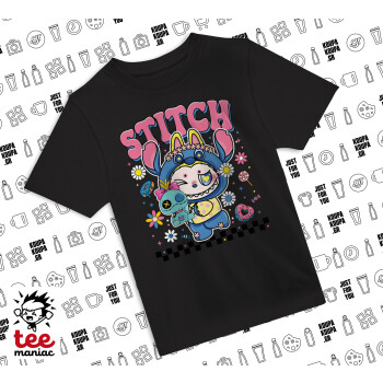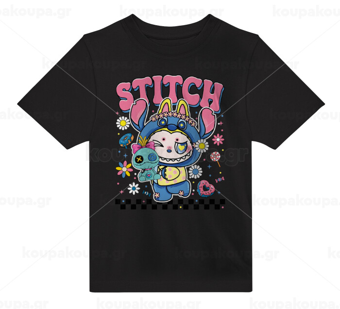 Labubu Stitch, Άνετο παιδικό T-Shirt ΜΑΥΡΟ από 100% βαμβάκι, για κάθε μέρα. Vegan & OEKO-TEX πιστοποιημένο.