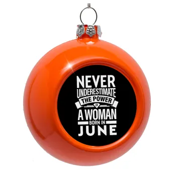 Never Underestimate the poer of a Woman born in..., Orange Christmas tree ornament bauble 8cm