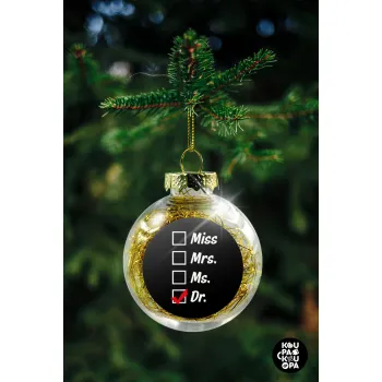 Miss, Mrs, Ms, DR, Transparent Christmas tree ball ornament with gold filling 8cm